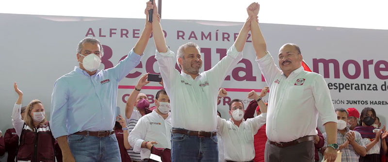 Durante el mitin en la ciudad de Los Reyes se dio a conocer la declinación de Abraham Sánchez a su candidatura a la gubernatura por el partido Redes Sociales Progresistas (RSP). Con ello ahora se inclina a favor de la candidatura que encabeza Alfredo Ramírez Bedolla, por Morena y Partido del Trabajo (PT).