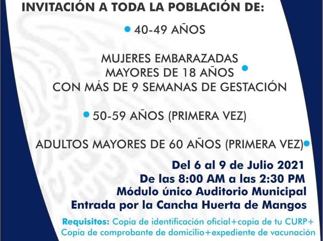 LOS REYES, MICH.- A partir de este martes 06 de julio y hasta el viernes 09 del mismo mes, se llevará a cabo aquí la vacunación anti COVID-19 a personas de entre 40 y 49 años de edad, así como embarazadas de 18 años en adelante y adultos mayores de 60 años y más que no se hayan inmunizado en la fase previa.