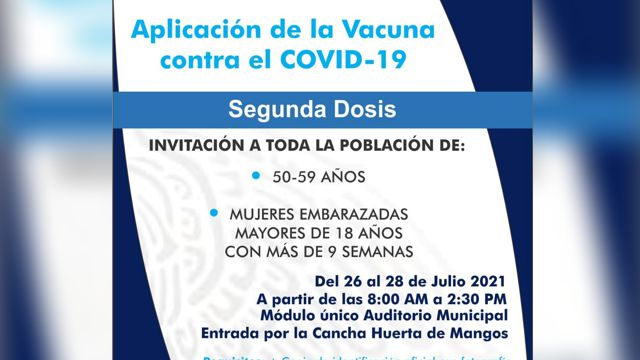 LOS REYES, MICH.- Del próximo lunes 26, al miércoles 28 de julio se llevará a cabo la aplicación de la segunda dosis de la vacuna contra el Covid-19 a personas de 50 a 59 años en el municipio de Los Reyes, con lo que se estará completando el esquema de vacunación a este sector de la ciudadanía.