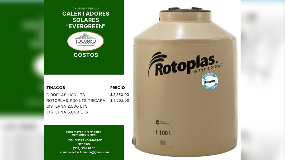 TOCUMBO, MICH.- Bajo la premisa de apoyar a las familias en estado de vulnerabilidad del municipio en la dignificación de sus viviendas, el Ayuntamiento de Peribán a través de la Dirección de Desarrollo Social ofrece tinacos, cisternas y calentadores solares con subsidios lo que permite que sus costos sean menores al comercial.