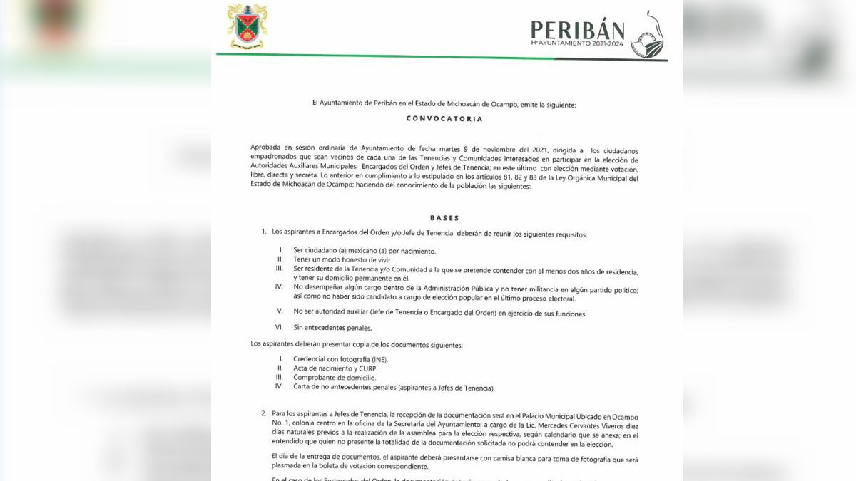 PERIBÁN, MICH.- El Ayuntamiento de Peribán que preside el presidente municipal Alfredo Arroyo Arroyo dio a conocer la convocatoria para la renovación de las Autoridades Auxiliares del municipio, convocatoria que fue aprobada en sesión ordinaria de cabildo celebrada el pasado 9 de noviembre del año en curso.