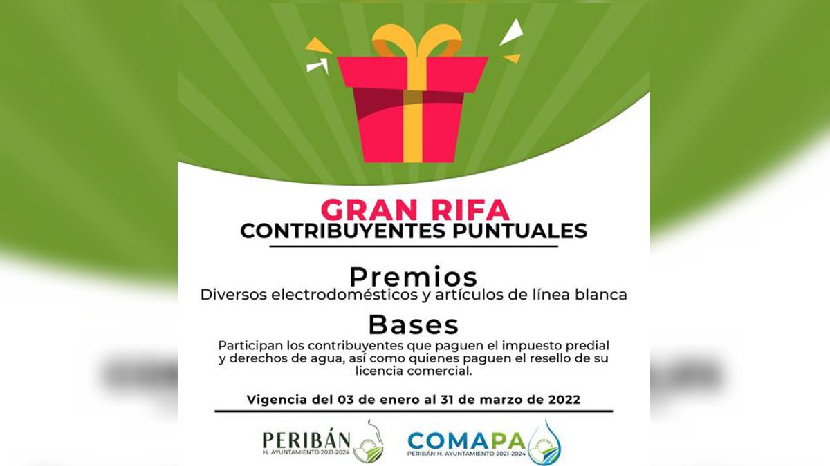 PERIBAN, MICH.- Con la rifa de diversos electrodomésticos y artículos de línea blanca, el gobierno municipal de Peribán que preside el alcalde Alfredo Arroyo Arroyo busca incentivar el pago del impuesto predial y derechos de agua entre la ciudadanía de este municipio, siempre y cuando lo hagan entre el 3 de enero y el 31 de marzo del año en curso.