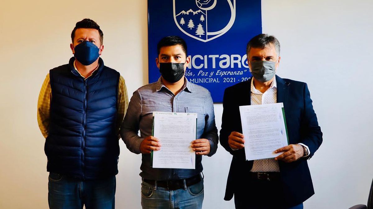 La firma del convenio realizada en la sala de cabildo de la presidencia, contó con la presencia del secretario del Ayuntamiento de Tancítaro David Morales Ríos por parte de la administración municipal y de Hugo Valdez Vargas y Mario Abraham Maciel Figueroa, director general y director de planeación y vinculación del tecnológico, respectivamente.
