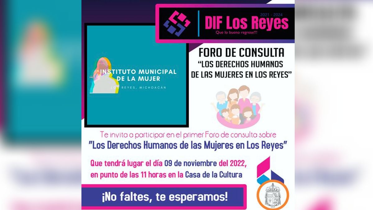 LOS REYES, MICH.- La Instancia Municipal de la Mujer (IMM), través del programa de Fortalecimiento a la transversalidad de la perspectiva de género, instrumentado por el Instituto Nacional de las Mujeres (InMujeres), llevará a cabo el próximo miércoles 9 de noviembre, el foro denominado “Los Derechos Humanos de la Mujeres en Los Reyes”.