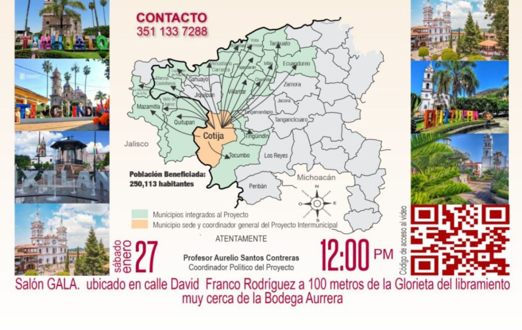 Cotija de la Paz a 24 de enero del 2024.- El coordinador político del Proyecto Maestro Aurelio Santos, ha invitado al CONCLAVE de puertas abiertas a las distintas ideologías, este próximo sábado 27 de enero del 2024, para abrir la convocatoria y formar parte de la estructura global regional para el proyecto intermunicipal de todo el distrito.