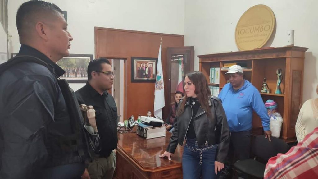 Con el compromiso de trabajar en favor de la ciudadanía, la Lic. Evangelina Villanueva Morales, Presidenta Municipal de Tocumbo, recibió la visita del Comisario Regional de Seguridad Pública, Eduardo Rincón Chávez. El evento tuvo lugar en el marco de una Sesión del Honorable Cabildo, donde la alcaldesa expuso necesidades en materia policial de la región y particularmente en el municipio, siendo la más sentida el “que se brinde un respeto absoluto a los Derechos Humanos de la ciudadanía y se proteja que diariamente transita por las rúas estatales que cruzan Tocumbo.