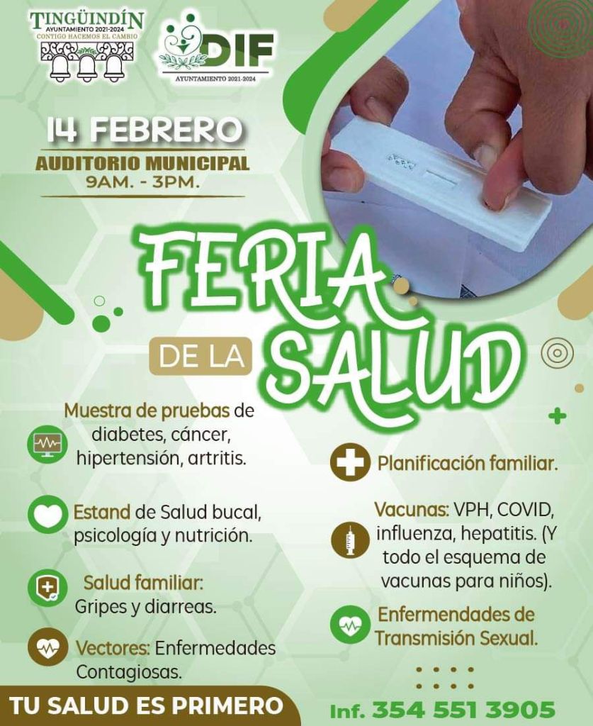 DIF TINGÜINDÍN INVITA A LA FERIA DE LA SALUD 2024, que se llevará a cabo el miércoles 14 de Febrero en el Auditorio Municipal de 9am a 6pm.