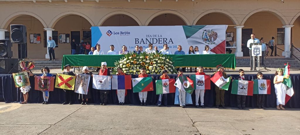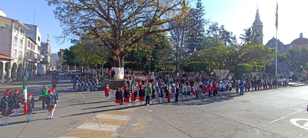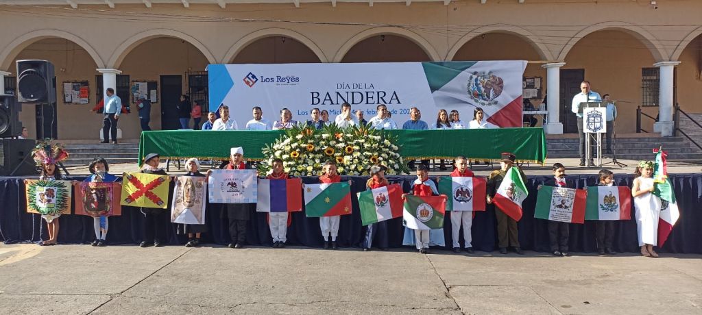El acto fue organizado por la Escuela Primaria “Melchor Ocampo”, turno matutino, y se llevó a cabo en punto de las 9:00 horas en los estrados de la presidencia municipal, iniciando con los honores cívicos de rigor y el juramento a la bandera. Enseguida, alumnos llevaron a cabo una lúcida representación, con sus respectivas reseñas, de los estandartes y banderas que ha tenido nuestro país, hasta el actual lábaro patrio.