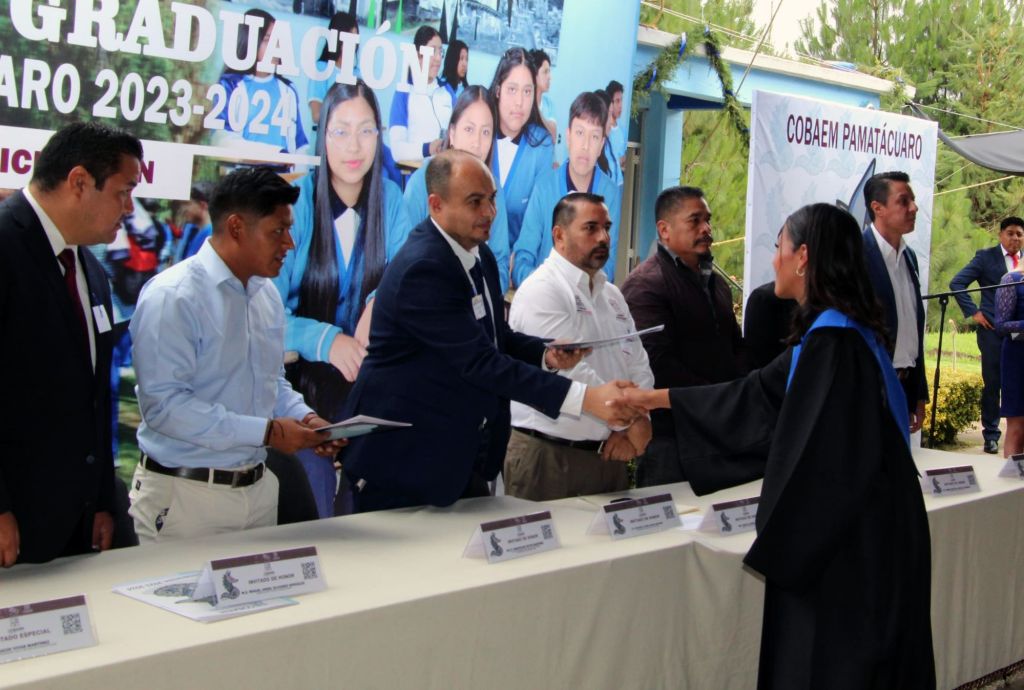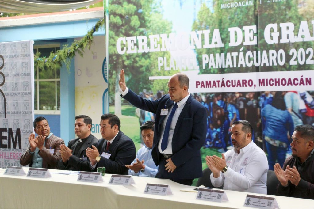 PAMATÁCUARO, MPIO. DE LOS REYES, MICH.- Con un llamado a continuar dando lo mejor de sí ante los retos que les depare el futuro, el alcalde Francisco Javier Oregel Martínez a acompañó a los 51 jóvenes que este jueves celebraron la culminación de su educación media superior en el Colegio de Bachilleres, plantel Pámatácuaro, como parte de la generación 2021-2024.