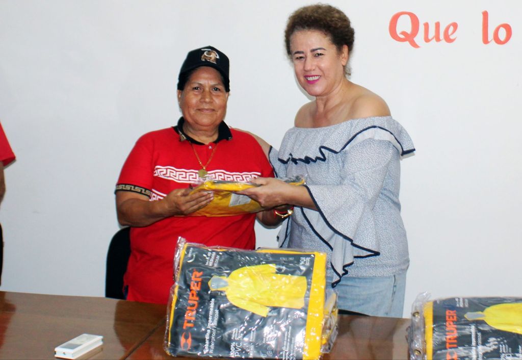 Enseguida, se realizó la entrega simbólica de varios de los 60 impermeables marca Truper, tipo gabardina, en beneficio de trabajadores de Servicios Públicos (aseo público, recolección de basura), Obras Públicas, Parques y Jardines, Unidad Deportiva Municipal “12 de Mayo”, Bloquera Municipal y Panteón Municipal.