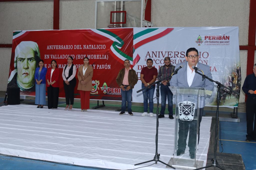 Peribán de Ramos a 27 de septiembre del 2024. Bajo la instrucción del alcalde Martín Escalera Bautista, orgulloso del gran personaje José María Morelos, el H. Ayuntamiento de Peribán 2024-2027 realizó la conmemoración CCLIX del natalicio del generalísimo José María Morelos y Pavón y el CCIII aniversario de la consumación de la Guerra de Independencia, con la participación de algunas instituciones educativas del municipio, el acto cívico de la conmemoración CCLIX tuvo lugar en el auditorio de esta ciudad, donde se compartió con la comunidad estudiantil reseña del natalicio de José María Morelos y Pavón, quien nació el 30 de septiembre de 1765 en Valladolid, Michoacán (hoy Morelia en su honor). Fue un sacerdote, militar insurgente y patriota mexicano que organizó y lideró la segunda etapa de la Guerra de Independencia Mexicana, nombrado jefe de los insurgentes en 1810, por el cura Miguel Hidalgo.