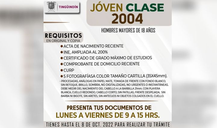 Convoca el Ayuntamiento de Tingüindín a jóvenes nacidos en 2004 a tramitar su cartilla del SMN